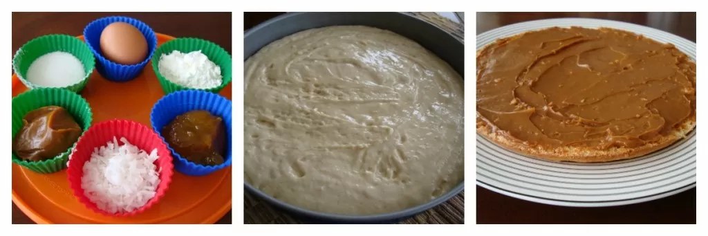 • 10. Para montar la tarta: Cortar la tarta en tres capas. Cubrir una de ellas con manjarblanco. Colocar encima la segunda capa. Untar ésta con mermelada, y colocar encima la tercera capa.