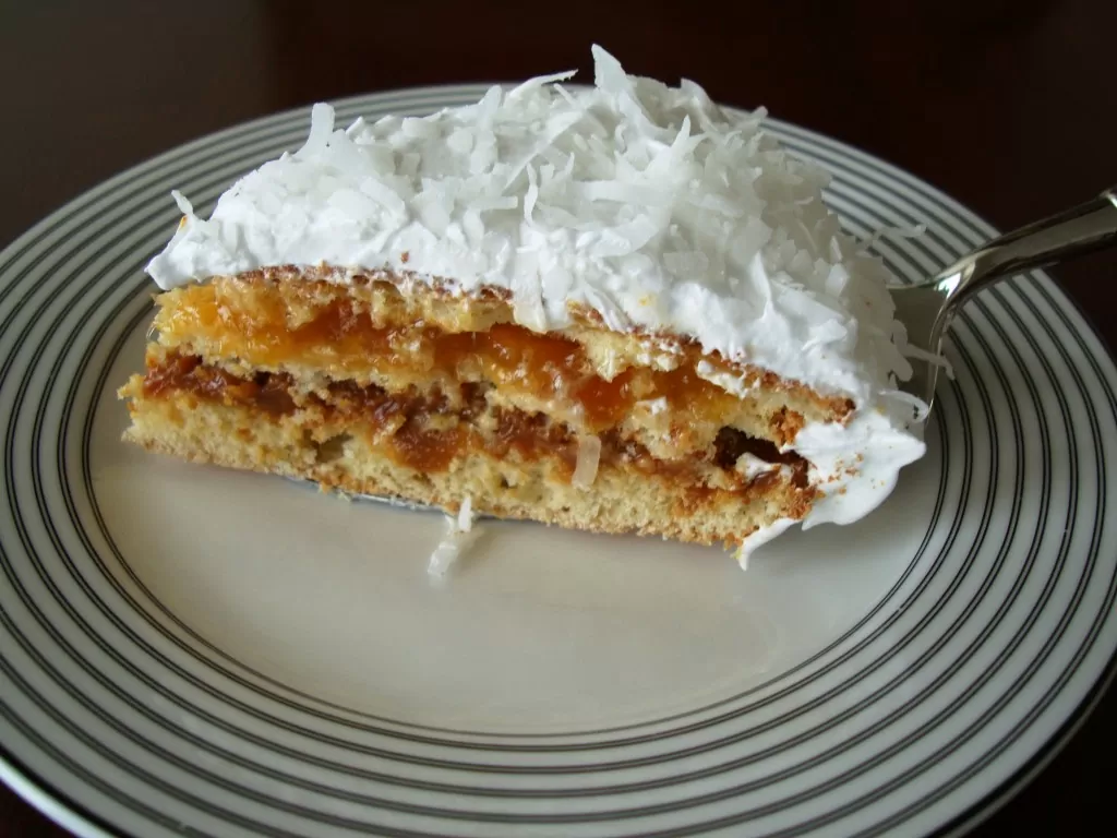 La primera vez que estuve en  Lima , era una ciudad “pequeña” con sólo 4 millones de habitantes (hoy viven allí casi 10 millones de personas). En el barrio muy elegante y tranquilo de  San Isidro , había una  pastelería encantadora  llamada  Capricho , que tenía los postres más increíbles   que había probado en mi vida. Uno de ellos era un  bizcocho  relleno con capas de  manjarblanco  ( dulce de leche ),  mermelada de albaricoque y cubierto con  merengue italiano  y  coco rallado . ¡Qué delicia!