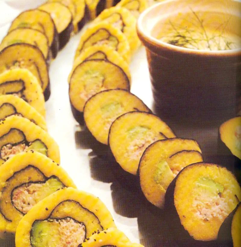 - 3. *Con ayuda del papel vegetal, enrollar como si fuera un rollo de sushi. Descanse y corte en trozos de 1 pulgada. Servir con la salsa de chile.