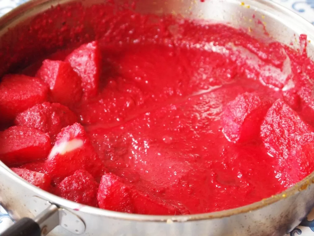 - 4. Cuando las papas estén listas, agregue a la sartén el jugo de remolacha y maní, y la carne cocida, si la usa. Calentar y sazonar si es necesario.